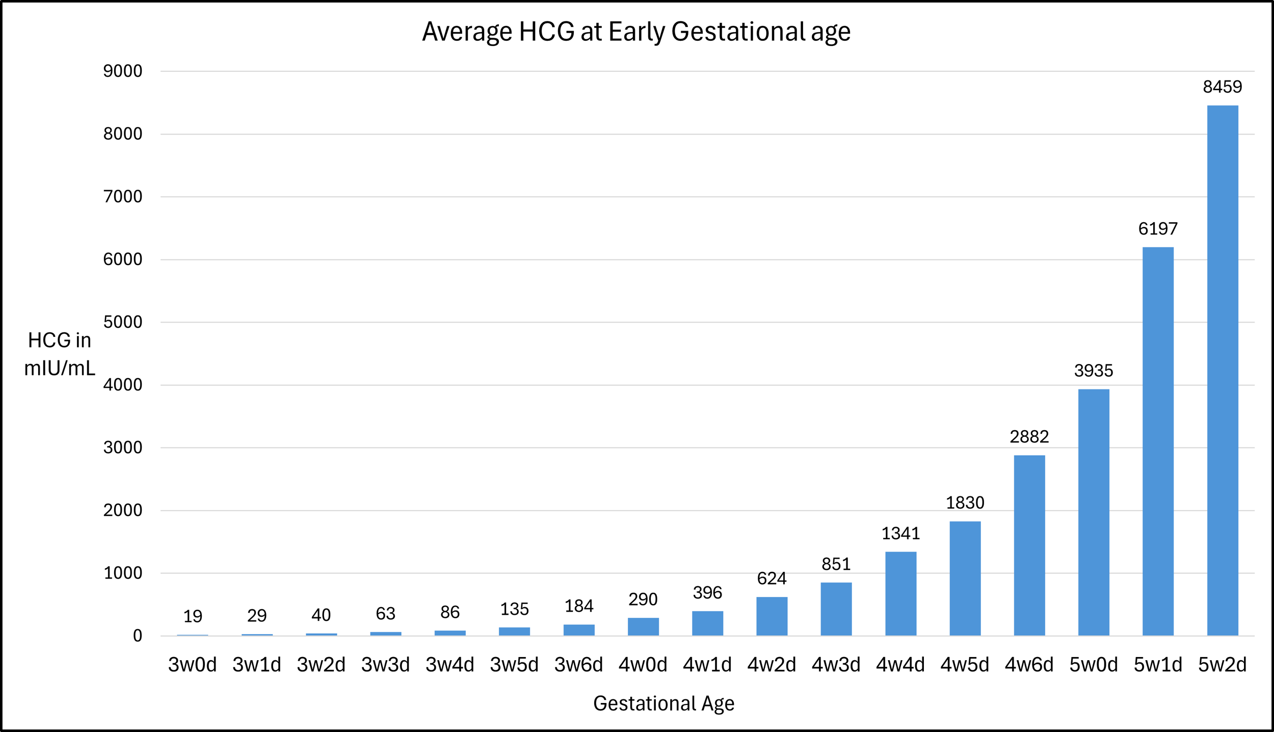 Based on euploid embryo transfer data, the average HCG at 4 weeks 5 days gestation is 1830 mIU/mL and this increases by an average of 115% every two days.